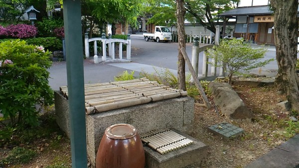 この石碑の裏には、穴が開いています。 奥には水があり、熱田の海の潮の干満と連動している、といわれます。 管理人は、まだ試していません。